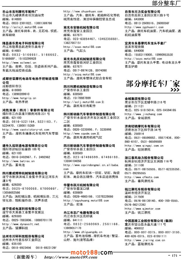 這兩年行業(yè)調(diào)整力度非常大,為了確保我們提供的信息準(zhǔn)確性,我們本著寧缺毋濫的原則,不去圖虛的數(shù)量。目前摩托車與配件行業(yè)的不少經(jīng)銷商是跨行業(yè)經(jīng)營的,所以我們在本書中增加了部分摩托車整車廠、電動車生產(chǎn)廠、機動三輪車制造廠。所選的這些企業(yè)都是這個行業(yè)具有影響力的品牌企業(yè),是為了大家在使用這本書時,獲取相關(guān)的延伸產(chǎn)業(yè)更多的實用信息。