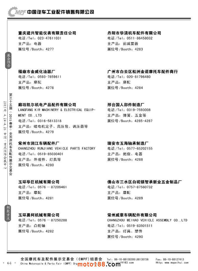 ”全國摩托車及配件展示會“(CMPF)是中國摩托車行業的傳統盛會,自1981年至今已成功舉辦了67季次(每年春、秋季各舉辦一次),現已發展成為行業內規模最大、專業觀眾最多、影響最廣泛、參展商最有收獲的全國性品牌展會。CMPF展會聚集了全國大部分摩托車配件生產企業與流通企業,是產需雙方進行貿易洽談、新產品技術推廣與交流的理想服務平臺。