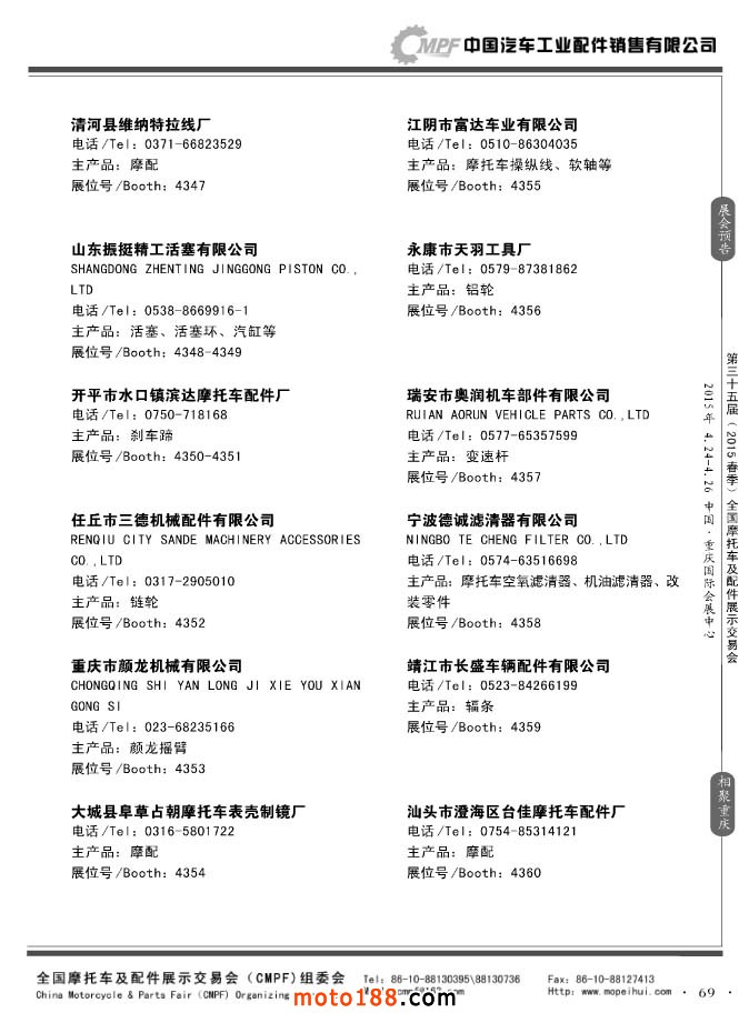 ”全國(guó)摩托車及配件展示會(huì)“(CMPF)是中國(guó)摩托車行業(yè)的傳統(tǒng)盛會(huì),自1981年至今已成功舉辦了67季次(每年春、秋季各舉辦一次),現(xiàn)已發(fā)展成為行業(yè)內(nèi)規(guī)模最大、專業(yè)觀眾最多、影響最廣泛、參展商最有收獲的全國(guó)性品牌展會(huì)。CMPF展會(huì)聚集了全國(guó)大部分摩托車配件生產(chǎn)企業(yè)與流通企業(yè),是產(chǎn)需雙方進(jìn)行貿(mào)易洽談、新產(chǎn)品技術(shù)推廣與交流的理想服務(wù)平臺(tái)。