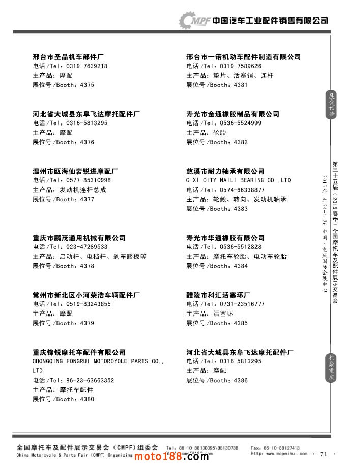 ”全國摩托車及配件展示會“(CMPF)是中國摩托車行業(yè)的傳統(tǒng)盛會,自1981年至今已成功舉辦了67季次(每年春、秋季各舉辦一次),現(xiàn)已發(fā)展成為行業(yè)內(nèi)規(guī)模最大、專業(yè)觀眾最多、影響最廣泛、參展商最有收獲的全國性品牌展會。CMPF展會聚集了全國大部分摩托車配件生產(chǎn)企業(yè)與流通企業(yè),是產(chǎn)需雙方進(jìn)行貿(mào)易洽談、新產(chǎn)品技術(shù)推廣與交流的理想服務(wù)平臺。