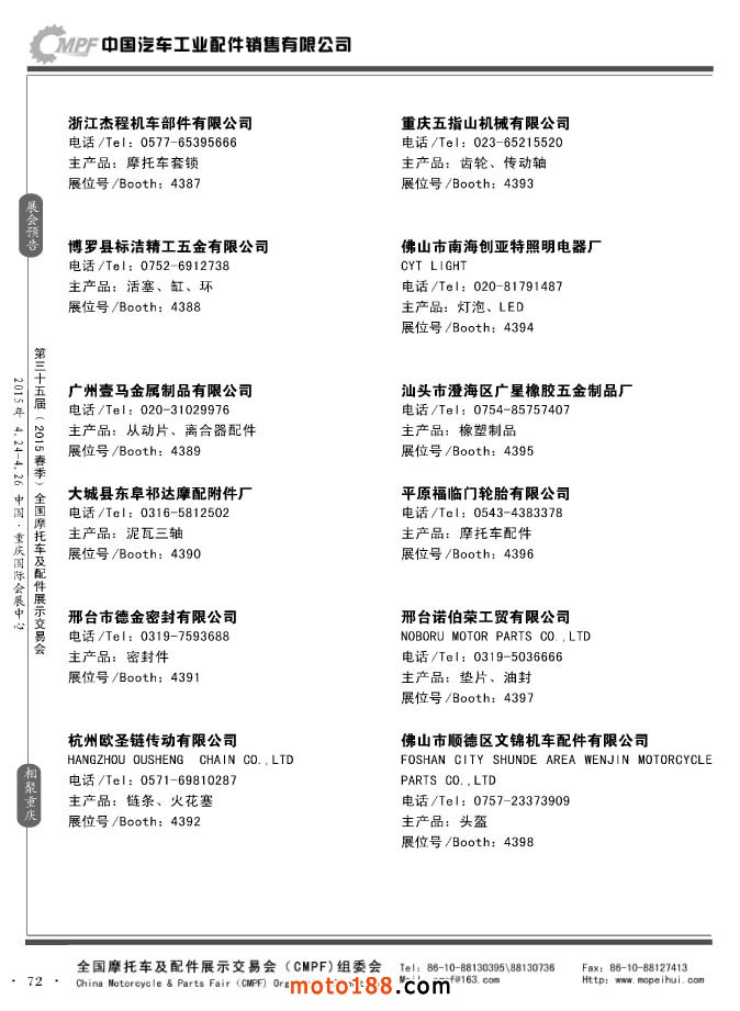 ”全國摩托車及配件展示會“(CMPF)是中國摩托車行業的傳統盛會,自1981年至今已成功舉辦了67季次(每年春、秋季各舉辦一次),現已發展成為行業內規模最大、專業觀眾最多、影響最廣泛、參展商最有收獲的全國性品牌展會。CMPF展會聚集了全國大部分摩托車配件生產企業與流通企業,是產需雙方進行貿易洽談、新產品技術推廣與交流的理想服務平臺。
