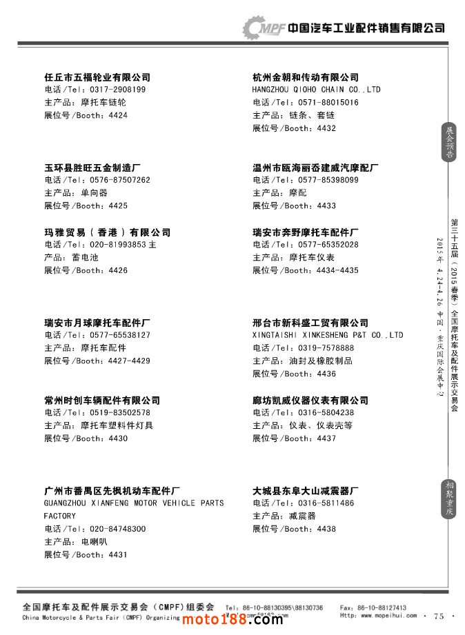 ”全國(guó)摩托車及配件展示會(huì)“(CMPF)是中國(guó)摩托車行業(yè)的傳統(tǒng)盛會(huì),自1981年至今已成功舉辦了67季次(每年春、秋季各舉辦一次),現(xiàn)已發(fā)展成為行業(yè)內(nèi)規(guī)模最大、專業(yè)觀眾最多、影響最廣泛、參展商最有收獲的全國(guó)性品牌展會(huì)。CMPF展會(huì)聚集了全國(guó)大部分摩托車配件生產(chǎn)企業(yè)與流通企業(yè),是產(chǎn)需雙方進(jìn)行貿(mào)易洽談、新產(chǎn)品技術(shù)推廣與交流的理想服務(wù)平臺(tái)。