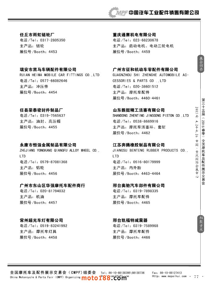 ”全國摩托車及配件展示會“(CMPF)是中國摩托車行業的傳統盛會,自1981年至今已成功舉辦了67季次(每年春、秋季各舉辦一次),現已發展成為行業內規模最大、專業觀眾最多、影響最廣泛、參展商最有收獲的全國性品牌展會。CMPF展會聚集了全國大部分摩托車配件生產企業與流通企業,是產需雙方進行貿易洽談、新產品技術推廣與交流的理想服務平臺。
