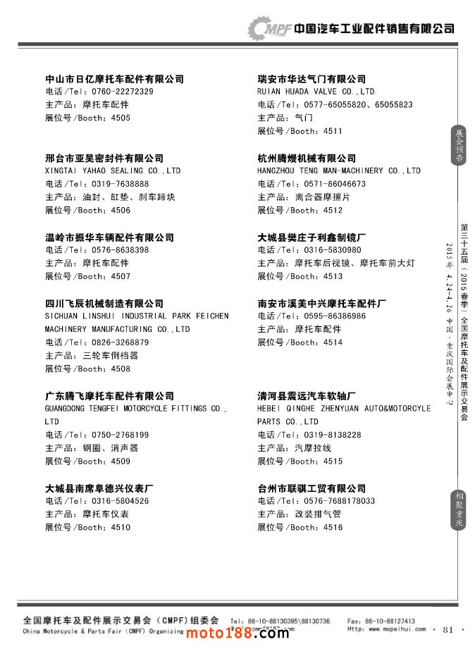 ”全國摩托車及配件展示會“(CMPF)是中國摩托車行業的傳統盛會,自1981年至今已成功舉辦了67季次(每年春、秋季各舉辦一次),現已發展成為行業內規模最大、專業觀眾最多、影響最廣泛、參展商最有收獲的全國性品牌展會。CMPF展會聚集了全國大部分摩托車配件生產企業與流通企業,是產需雙方進行貿易洽談、新產品技術推廣與交流的理想服務平臺。