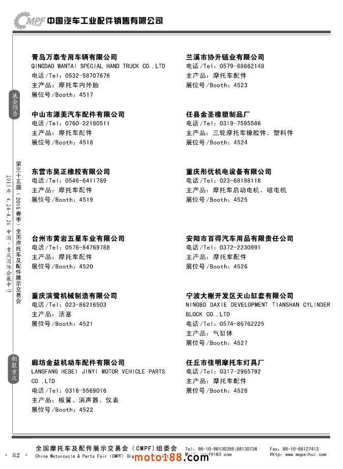 ”全國摩托車及配件展示會“(CMPF)是中國摩托車行業的傳統盛會,自1981年至今已成功舉辦了67季次(每年春、秋季各舉辦一次),現已發展成為行業內規模最大、專業觀眾最多、影響最廣泛、參展商最有收獲的全國性品牌展會。CMPF展會聚集了全國大部分摩托車配件生產企業與流通企業,是產需雙方進行貿易洽談、新產品技術推廣與交流的理想服務平臺。