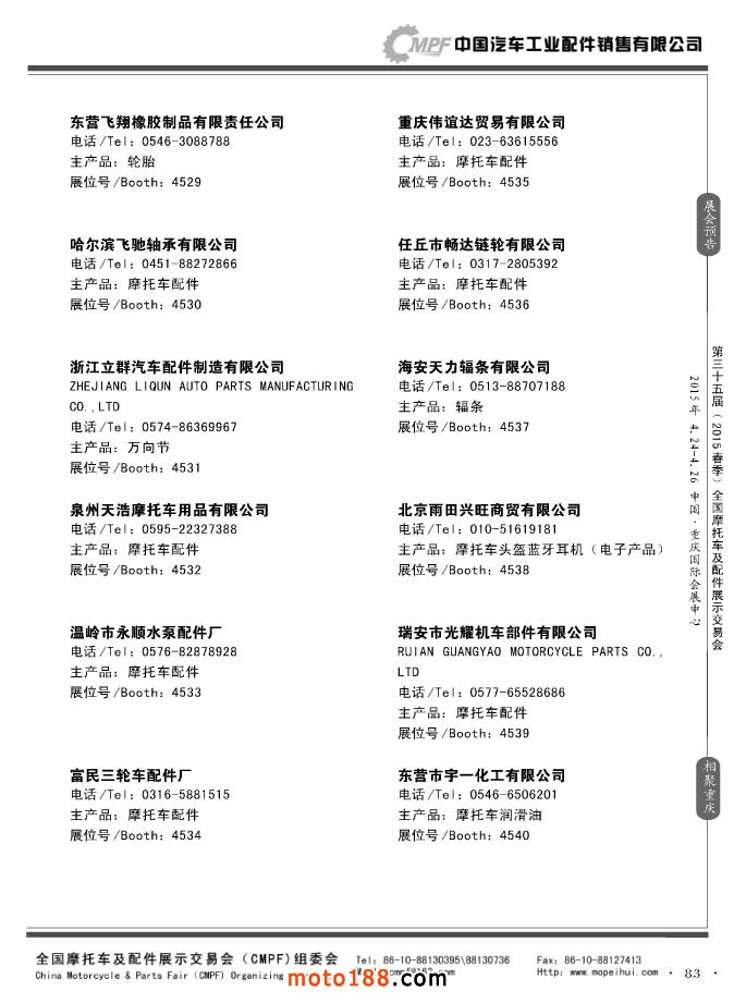 ”全國摩托車及配件展示會“(CMPF)是中國摩托車行業(yè)的傳統(tǒng)盛會,自1981年至今已成功舉辦了67季次(每年春、秋季各舉辦一次),現(xiàn)已發(fā)展成為行業(yè)內(nèi)規(guī)模最大、專業(yè)觀眾最多、影響最廣泛、參展商最有收獲的全國性品牌展會。CMPF展會聚集了全國大部分摩托車配件生產(chǎn)企業(yè)與流通企業(yè),是產(chǎn)需雙方進(jìn)行貿(mào)易洽談、新產(chǎn)品技術(shù)推廣與交流的理想服務(wù)平臺。