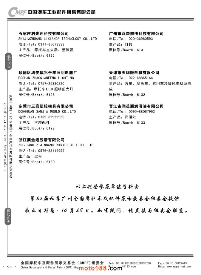 ”全國摩托車及配件展示會(huì)“(CMPF)是中國摩托車行業(yè)的傳統(tǒng)盛會(huì),自1981年至今已成功舉辦了67季次(每年春、秋季各舉辦一次),現(xiàn)已發(fā)展成為行業(yè)內(nèi)規(guī)模最大、專業(yè)觀眾最多、影響最廣泛、參展商最有收獲的全國性品牌展會(huì)。CMPF展會(huì)聚集了全國大部分摩托車配件生產(chǎn)企業(yè)與流通企業(yè),是產(chǎn)需雙方進(jìn)行貿(mào)易洽談、新產(chǎn)品技術(shù)推廣與交流的理想服務(wù)平臺(tái)。