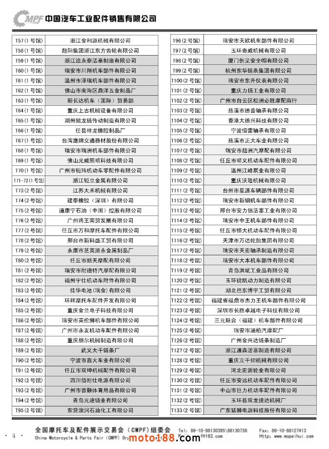 ”全國摩托車及配件展示會(huì)“(CMPF)是中國摩托車行業(yè)的傳統(tǒng)盛會(huì),自1981年至今已成功舉辦了67季次(每年春、秋季各舉辦一次),現(xiàn)已發(fā)展成為行業(yè)內(nèi)規(guī)模最大、專業(yè)觀眾最多、影響最廣泛、參展商最有收獲的全國性品牌展會(huì)。CMPF展會(huì)聚集了全國大部分摩托車配件生產(chǎn)企業(yè)與流通企業(yè),是產(chǎn)需雙方進(jìn)行貿(mào)易洽談、新產(chǎn)品技術(shù)推廣與交流的理想服務(wù)平臺。
