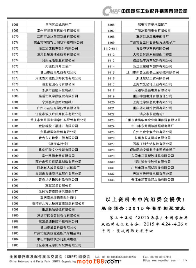”全國摩托車及配件展示會“(CMPF)是中國摩托車行業的傳統盛會,自1981年至今已成功舉辦了67季次(每年春、秋季各舉辦一次),現已發展成為行業內規模最大、專業觀眾最多、影響最廣泛、參展商最有收獲的全國性品牌展會。CMPF展會聚集了全國大部分摩托車配件生產企業與流通企業,是產需雙方進行貿易洽談、新產品技術推廣與交流的理想服務平臺。