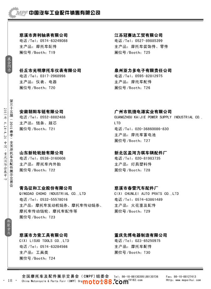 ”全國摩托車及配件展示會“(CMPF)是中國摩托車行業的傳統盛會,自1981年至今已成功舉辦了67季次(每年春、秋季各舉辦一次),現已發展成為行業內規模最大、專業觀眾最多、影響最廣泛、參展商最有收獲的全國性品牌展會。CMPF展會聚集了全國大部分摩托車配件生產企業與流通企業,是產需雙方進行貿易洽談、新產品技術推廣與交流的理想服務平臺。