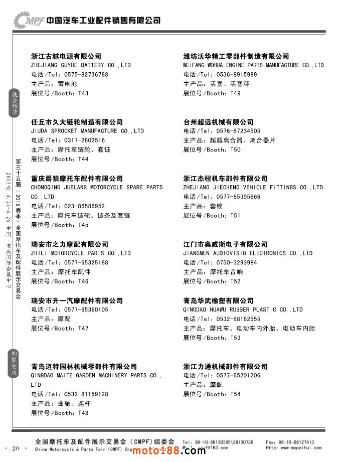 ”全國摩托車及配件展示會“(CMPF)是中國摩托車行業的傳統盛會,自1981年至今已成功舉辦了67季次(每年春、秋季各舉辦一次),現已發展成為行業內規模最大、專業觀眾最多、影響最廣泛、參展商最有收獲的全國性品牌展會。CMPF展會聚集了全國大部分摩托車配件生產企業與流通企業,是產需雙方進行貿易洽談、新產品技術推廣與交流的理想服務平臺。