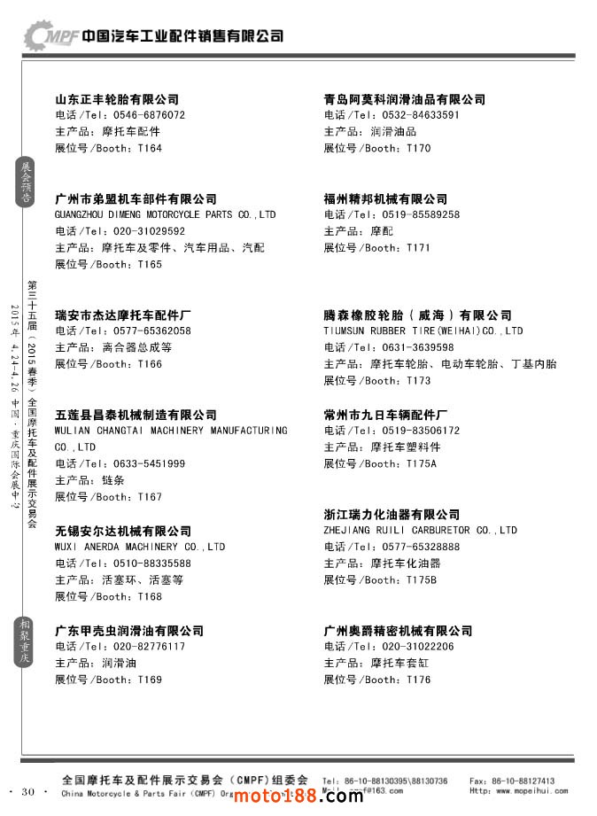 ”全國摩托車及配件展示會“(CMPF)是中國摩托車行業的傳統盛會,自1981年至今已成功舉辦了67季次(每年春、秋季各舉辦一次),現已發展成為行業內規模最大、專業觀眾最多、影響最廣泛、參展商最有收獲的全國性品牌展會。CMPF展會聚集了全國大部分摩托車配件生產企業與流通企業,是產需雙方進行貿易洽談、新產品技術推廣與交流的理想服務平臺。
