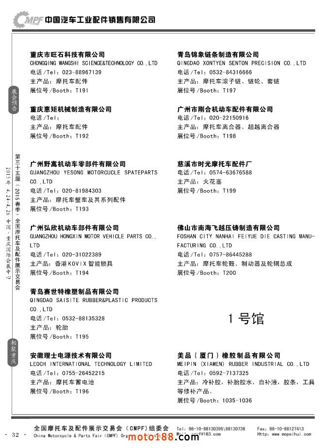 ”全國摩托車及配件展示會(huì)“(CMPF)是中國摩托車行業(yè)的傳統(tǒng)盛會(huì),自1981年至今已成功舉辦了67季次(每年春、秋季各舉辦一次),現(xiàn)已發(fā)展成為行業(yè)內(nèi)規(guī)模最大、專業(yè)觀眾最多、影響最廣泛、參展商最有收獲的全國性品牌展會(huì)。CMPF展會(huì)聚集了全國大部分摩托車配件生產(chǎn)企業(yè)與流通企業(yè),是產(chǎn)需雙方進(jìn)行貿(mào)易洽談、新產(chǎn)品技術(shù)推廣與交流的理想服務(wù)平臺。