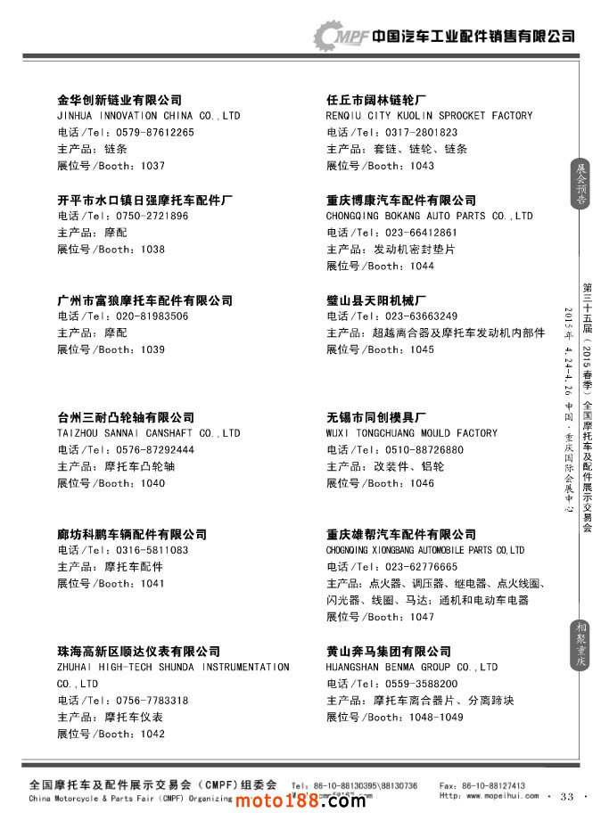 ”全國摩托車及配件展示會“(CMPF)是中國摩托車行業的傳統盛會,自1981年至今已成功舉辦了67季次(每年春、秋季各舉辦一次),現已發展成為行業內規模最大、專業觀眾最多、影響最廣泛、參展商最有收獲的全國性品牌展會。CMPF展會聚集了全國大部分摩托車配件生產企業與流通企業,是產需雙方進行貿易洽談、新產品技術推廣與交流的理想服務平臺。