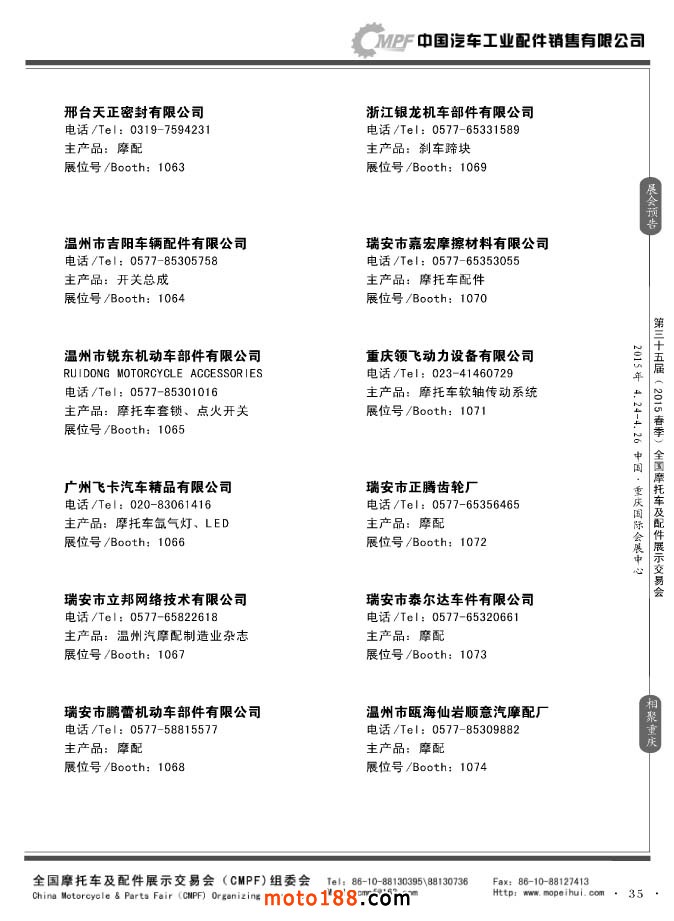 ”全國摩托車及配件展示會“(CMPF)是中國摩托車行業的傳統盛會,自1981年至今已成功舉辦了67季次(每年春、秋季各舉辦一次),現已發展成為行業內規模最大、專業觀眾最多、影響最廣泛、參展商最有收獲的全國性品牌展會。CMPF展會聚集了全國大部分摩托車配件生產企業與流通企業,是產需雙方進行貿易洽談、新產品技術推廣與交流的理想服務平臺。