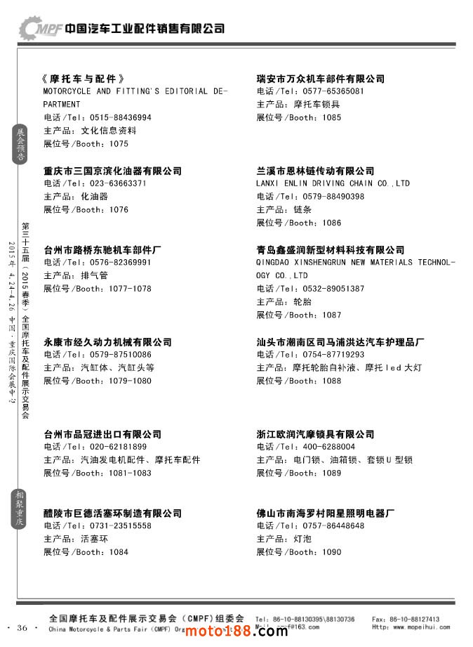 ”全國摩托車及配件展示會“(CMPF)是中國摩托車行業的傳統盛會,自1981年至今已成功舉辦了67季次(每年春、秋季各舉辦一次),現已發展成為行業內規模最大、專業觀眾最多、影響最廣泛、參展商最有收獲的全國性品牌展會。CMPF展會聚集了全國大部分摩托車配件生產企業與流通企業,是產需雙方進行貿易洽談、新產品技術推廣與交流的理想服務平臺。