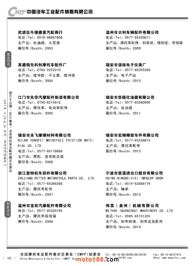 ”全國摩托車及配件展示會(huì)“(CMPF)是中國摩托車行業(yè)的傳統(tǒng)盛會(huì),自1981年至今已成功舉辦了67季次(每年春、秋季各舉辦一次),現(xiàn)已發(fā)展成為行業(yè)內(nèi)規(guī)模最大、專業(yè)觀眾最多、影響最廣泛、參展商最有收獲的全國性品牌展會(huì)。CMPF展會(huì)聚集了全國大部分摩托車配件生產(chǎn)企業(yè)與流通企業(yè),是產(chǎn)需雙方進(jìn)行貿(mào)易洽談、新產(chǎn)品技術(shù)推廣與交流的理想服務(wù)平臺(tái)。