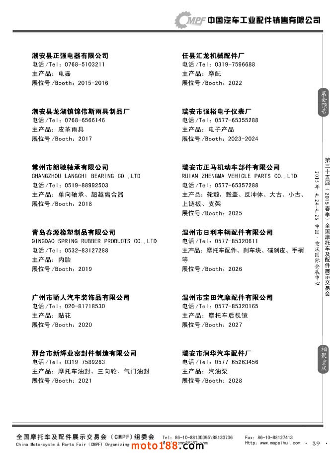”全國(guó)摩托車及配件展示會(huì)“(CMPF)是中國(guó)摩托車行業(yè)的傳統(tǒng)盛會(huì),自1981年至今已成功舉辦了67季次(每年春、秋季各舉辦一次),現(xiàn)已發(fā)展成為行業(yè)內(nèi)規(guī)模最大、專業(yè)觀眾最多、影響最廣泛、參展商最有收獲的全國(guó)性品牌展會(huì)。CMPF展會(huì)聚集了全國(guó)大部分摩托車配件生產(chǎn)企業(yè)與流通企業(yè),是產(chǎn)需雙方進(jìn)行貿(mào)易洽談、新產(chǎn)品技術(shù)推廣與交流的理想服務(wù)平臺(tái)。