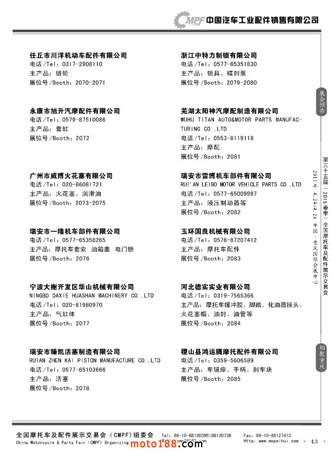 ”全國摩托車及配件展示會“(CMPF)是中國摩托車行業的傳統盛會,自1981年至今已成功舉辦了67季次(每年春、秋季各舉辦一次),現已發展成為行業內規模最大、專業觀眾最多、影響最廣泛、參展商最有收獲的全國性品牌展會。CMPF展會聚集了全國大部分摩托車配件生產企業與流通企業,是產需雙方進行貿易洽談、新產品技術推廣與交流的理想服務平臺。