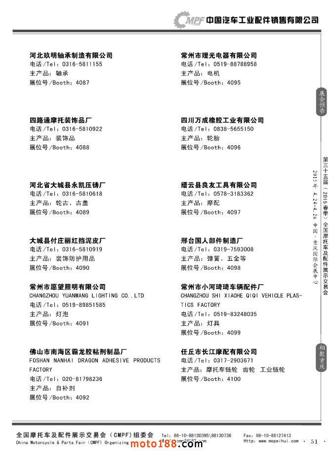 ”全國摩托車及配件展示會“(CMPF)是中國摩托車行業的傳統盛會,自1981年至今已成功舉辦了67季次(每年春、秋季各舉辦一次),現已發展成為行業內規模最大、專業觀眾最多、影響最廣泛、參展商最有收獲的全國性品牌展會。CMPF展會聚集了全國大部分摩托車配件生產企業與流通企業,是產需雙方進行貿易洽談、新產品技術推廣與交流的理想服務平臺。