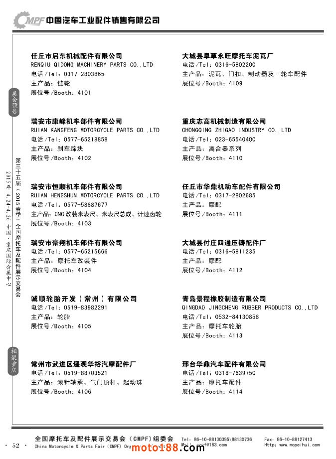 ”全國(guó)摩托車及配件展示會(huì)“(CMPF)是中國(guó)摩托車行業(yè)的傳統(tǒng)盛會(huì),自1981年至今已成功舉辦了67季次(每年春、秋季各舉辦一次),現(xiàn)已發(fā)展成為行業(yè)內(nèi)規(guī)模最大、專業(yè)觀眾最多、影響最廣泛、參展商最有收獲的全國(guó)性品牌展會(huì)。CMPF展會(huì)聚集了全國(guó)大部分摩托車配件生產(chǎn)企業(yè)與流通企業(yè),是產(chǎn)需雙方進(jìn)行貿(mào)易洽談、新產(chǎn)品技術(shù)推廣與交流的理想服務(wù)平臺(tái)。