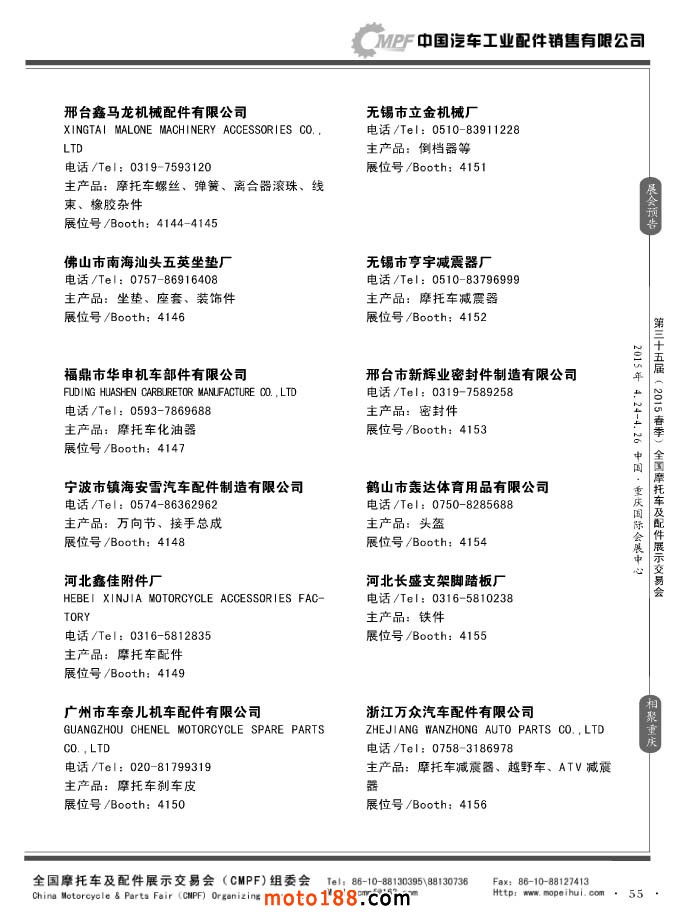 ”全國摩托車及配件展示會“(CMPF)是中國摩托車行業的傳統盛會,自1981年至今已成功舉辦了67季次(每年春、秋季各舉辦一次),現已發展成為行業內規模最大、專業觀眾最多、影響最廣泛、參展商最有收獲的全國性品牌展會。CMPF展會聚集了全國大部分摩托車配件生產企業與流通企業,是產需雙方進行貿易洽談、新產品技術推廣與交流的理想服務平臺。