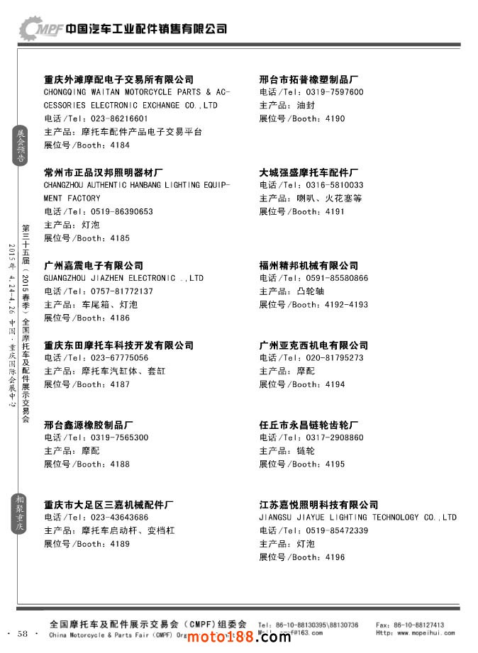 ”全國摩托車及配件展示會“(CMPF)是中國摩托車行業(yè)的傳統(tǒng)盛會,自1981年至今已成功舉辦了67季次(每年春、秋季各舉辦一次),現(xiàn)已發(fā)展成為行業(yè)內(nèi)規(guī)模最大、專業(yè)觀眾最多、影響最廣泛、參展商最有收獲的全國性品牌展會。CMPF展會聚集了全國大部分摩托車配件生產(chǎn)企業(yè)與流通企業(yè),是產(chǎn)需雙方進(jìn)行貿(mào)易洽談、新產(chǎn)品技術(shù)推廣與交流的理想服務(wù)平臺。