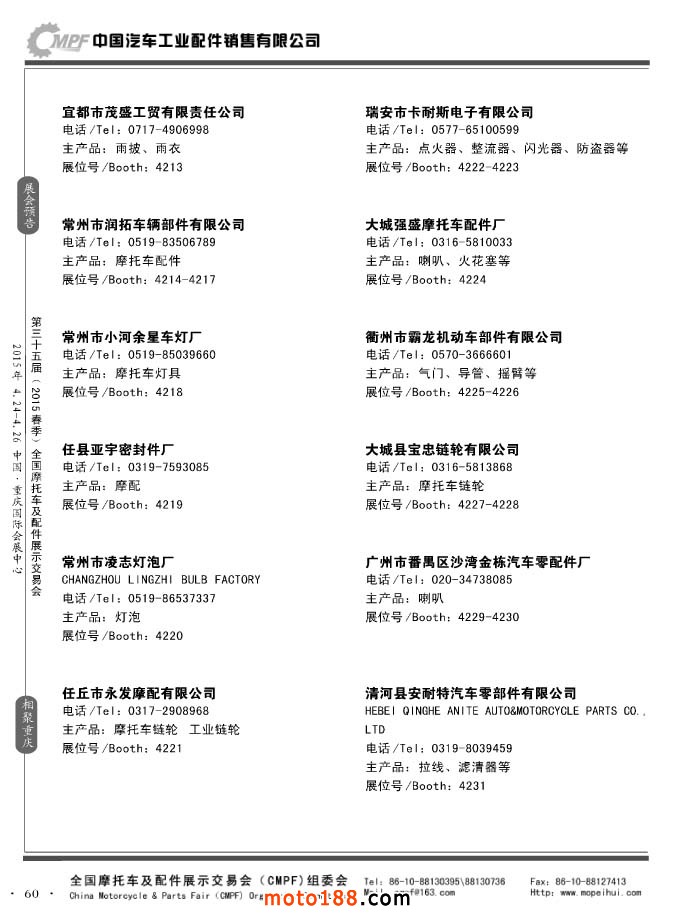 ”全國摩托車及配件展示會“(CMPF)是中國摩托車行業的傳統盛會,自1981年至今已成功舉辦了67季次(每年春、秋季各舉辦一次),現已發展成為行業內規模最大、專業觀眾最多、影響最廣泛、參展商最有收獲的全國性品牌展會。CMPF展會聚集了全國大部分摩托車配件生產企業與流通企業,是產需雙方進行貿易洽談、新產品技術推廣與交流的理想服務平臺。