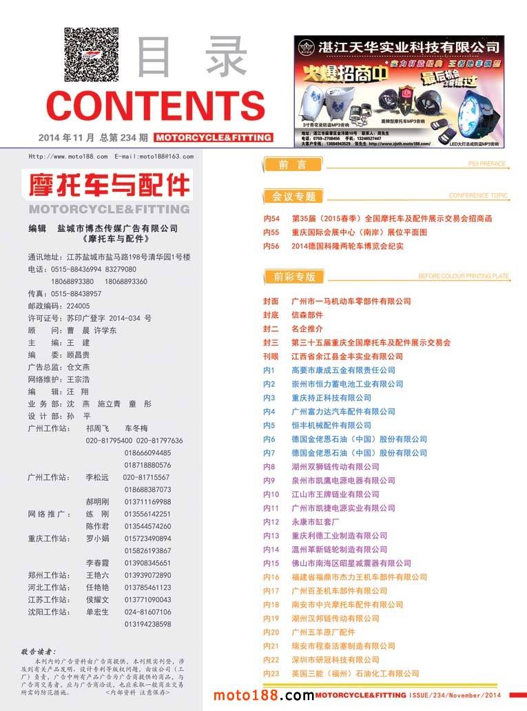 行業大型展會——第三十四屆秋季廣州全摩會會展期間,由于雜志廣告版面較多,原定出版的配件套缸專題和三輪車行業的相關信息專題移至下期出刊。
