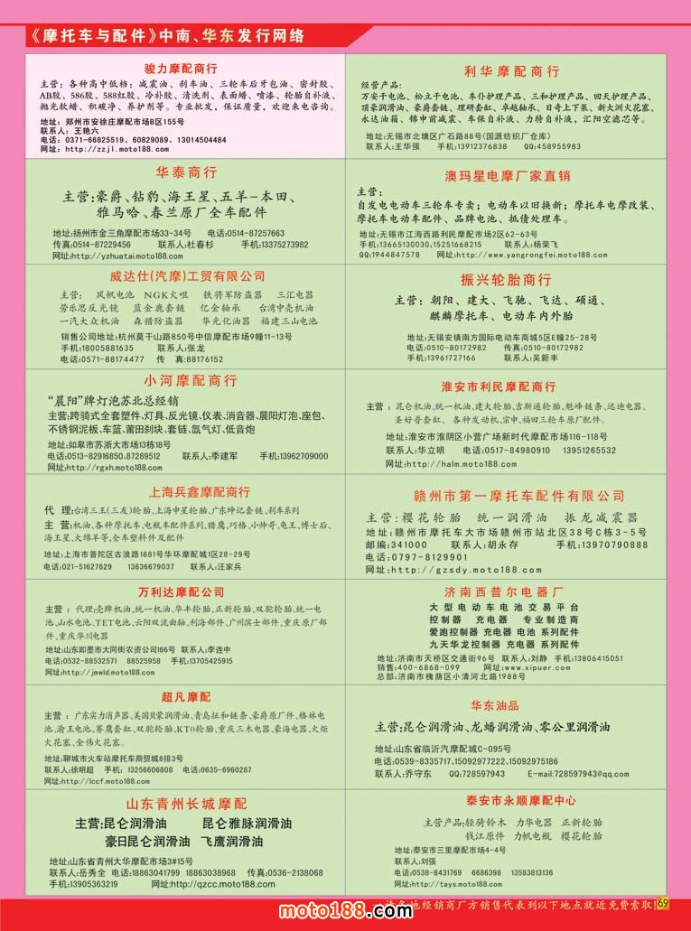 年每月一期,月刊。目前摩托車配件行業雖然只剩我們一家雜志,行業形勢也每況愈下,但我們的印量、發行、價格等均保持不變。根據行業、市場的變化,在明年將增加對三輪車行業及電動車配件行業的信息發布。