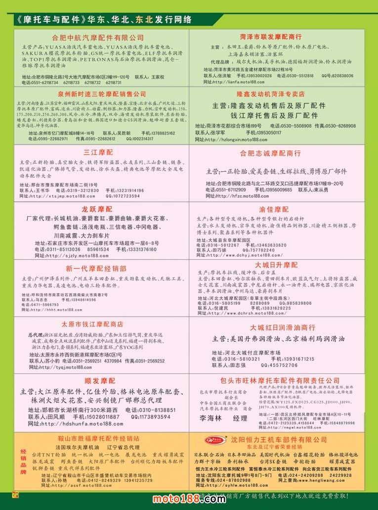 年配件生產(chǎn)企業(yè)大全第十二次升級(jí)版》在本次會(huì)期首發(fā),在全國摩配市場都有發(fā)行,來自這些市場的企業(yè)可到雜志的發(fā)行網(wǎng)點(diǎn)領(lǐng)取。