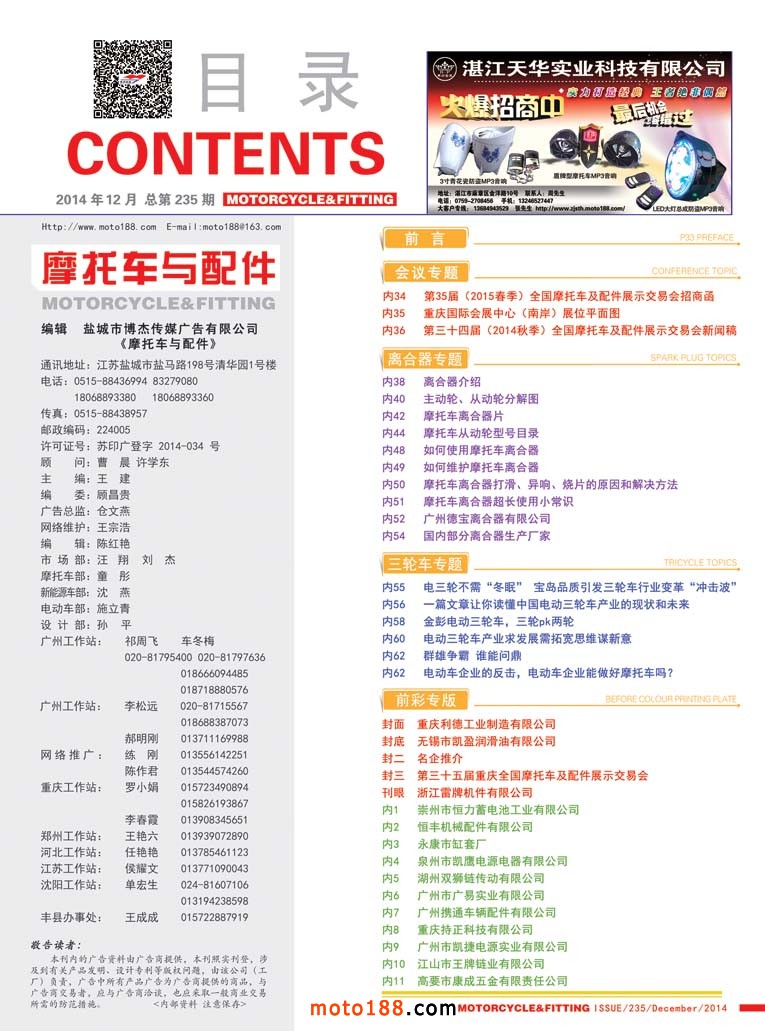 天氣在漸漸變冷,時令將進入冬季,對于南方市場來說,將迎來元旦、春節的節日市場,并達到新年銷售的高潮;對于北方市場來說,冬季則將步入淡季。對我們雜志社來說,冬季也將了收官階段,開始規劃新一年的工作,凡事預則立,不預則廢。為了明年更好的開展工作,我們雜志社規劃在2015年的工作分三條線開展:一是為了2015年的春季重慶全國摩托車及配件展示交易會的召開編寫新版的《西南(川渝)市場指南》,明年上半年的配件行業的工作重點放置在西南地區;春季重慶全摩會也涉及新能源行業,我們雜志也將為這一專題做好相應的工作。二是在2014年我們雜志社參與了很多的在電動車、三輪車行業的會議,頻率大概是每月參加4次會議,同時增加了重點市場的投放,但是工作進展卻不盡人意,在明年的工作中我們將會增加這一塊的投入,加大工作力度;同時把這個行業大數據進行整理匯總,初步統計有5~7萬家的資料需要核對,由于工作量巨大,此項工作目前已經開始進行。三是我們今年新出刊的《新能源車》雜志,明年將以月刊的形式出刊,同時在全國有新能源汽車的市場做到全覆蓋,除了做到最好之外,把同行甩得更遠。