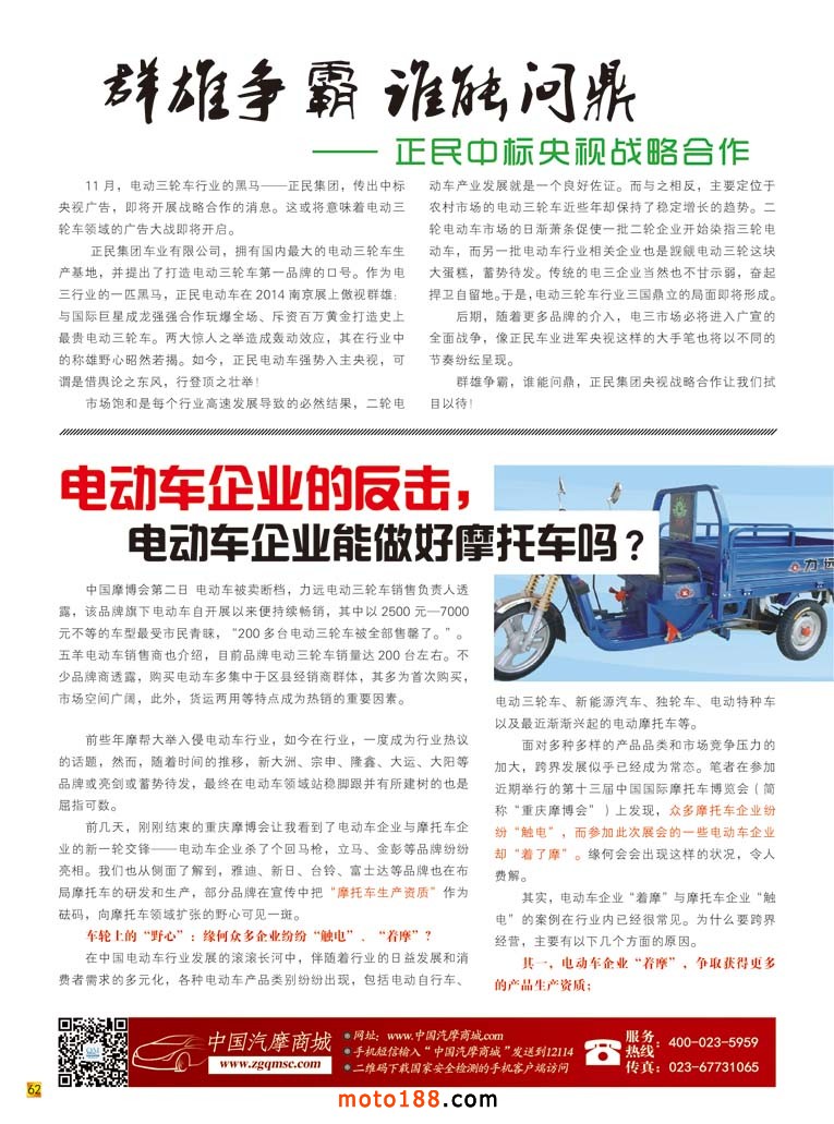 天氣在漸漸變冷,時令將進入冬季,對于南方市場來說,將迎來元旦、春節的節日市場,并達到新年銷售的高潮;對于北方市場來說,冬季則將步入淡季。對我們雜志社來說,冬季也將了收官階段,開始規劃新一年的工作,凡事預則立,不預則廢。為了明年更好的開展工作,我們雜志社規劃在2015年的工作分三條線開展:一是為了2015年的春季重慶全國摩托車及配件展示交易會的召開編寫新版的《西南(川渝)市場指南》,明年上半年的配件行業的工作重點放置在西南地區;春季重慶全摩會也涉及新能源行業,我們雜志也將為這一專題做好相應的工作。二是在2014年我們雜志社參與了很多的在電動車、三輪車行業的會議,頻率大概是每月參加4次會議,同時增加了重點市場的投放,但是工作進展卻不盡人意,在明年的工作中我們將會增加這一塊的投入,加大工作力度;同時把這個行業大數據進行整理匯總,初步統計有5~7萬家的資料需要核對,由于工作量巨大,此項工作目前已經開始進行。三是我們今年新出刊的《新能源車》雜志,明年將以月刊的形式出刊,同時在全國有新能源汽車的市場做到全覆蓋,除了做到最好之外,把同行甩得更遠。
