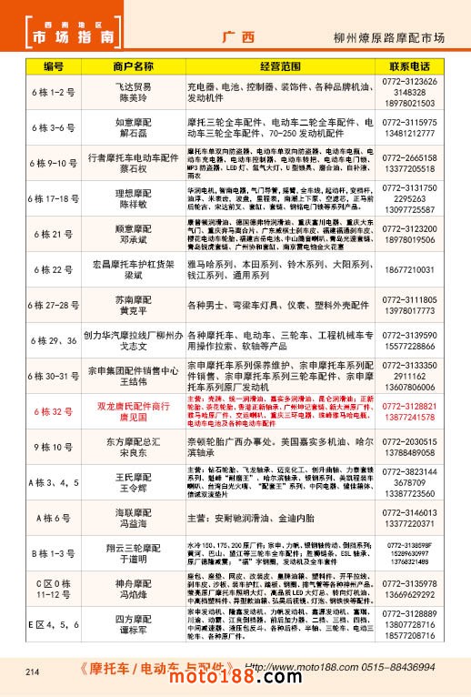 內(nèi)214 柳州市燎原路摩配市場經(jīng)銷商名錄