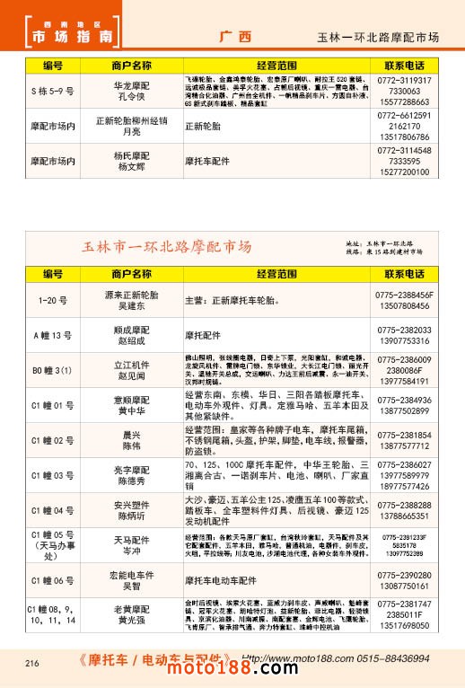 內216 玉林市一環北路摩配市場經銷商名錄