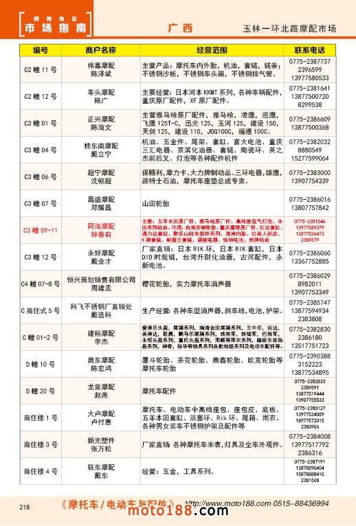 內218 玉林市一環北路摩配市場經銷商名錄