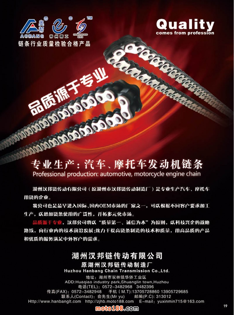 今年第四期雜志雖然在全國(guó)市場(chǎng)都有發(fā)行,一些不在市場(chǎng)的地區(qū)商戶除了通過(guò)www.moto188.com網(wǎng)站閱讀,也可到我們展位直接領(lǐng)取。由于本期雜志需要宣傳的企業(yè)較多,原來(lái)的摩托車(chē)及電動(dòng)車(chē)行業(yè)的資訊的內(nèi)容,順延到下一期發(fā)布。