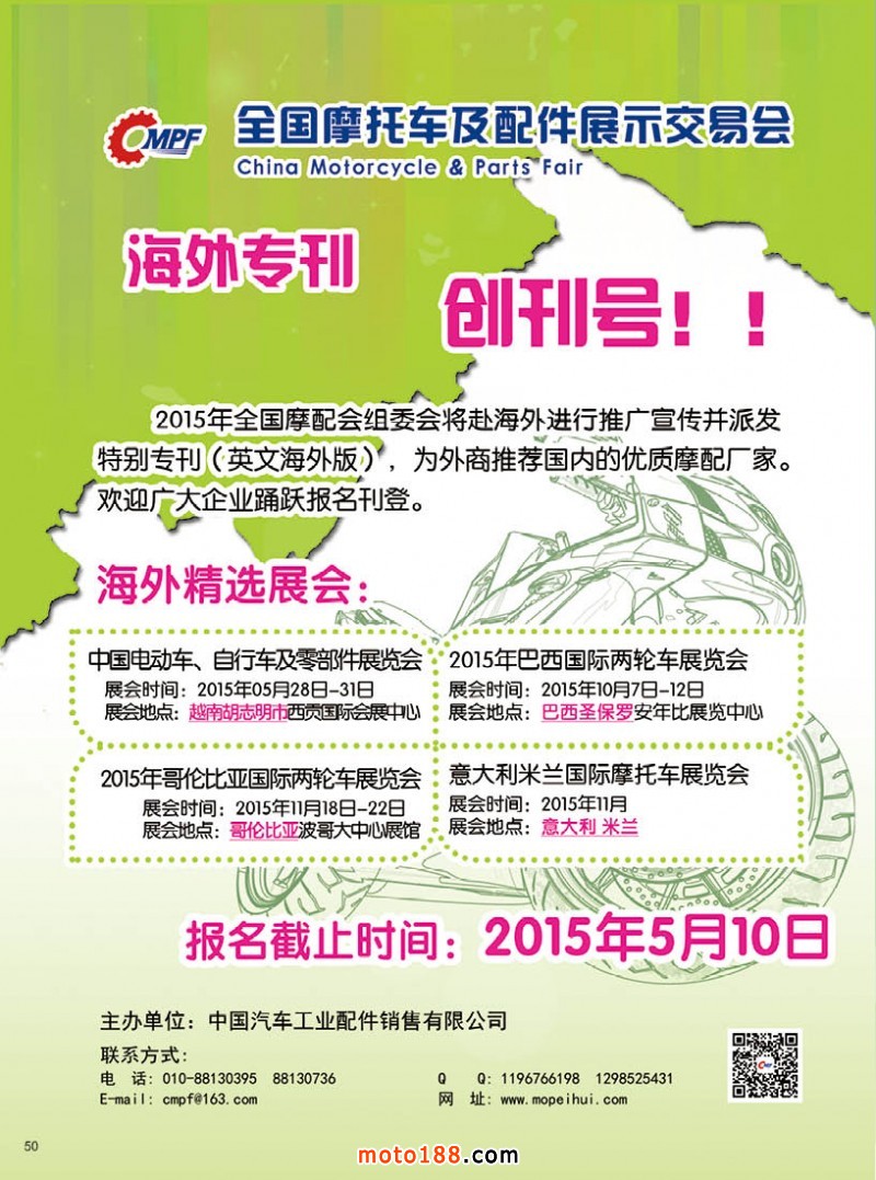 今年第四期雜志雖然在全國(guó)市場(chǎng)都有發(fā)行,一些不在市場(chǎng)的地區(qū)商戶除了通過www.moto188.com網(wǎng)站閱讀,也可到我們展位直接領(lǐng)取。由于本期雜志需要宣傳的企業(yè)較多,原來的摩托車及電動(dòng)車行業(yè)的資訊的內(nèi)容,順延到下一期發(fā)布。