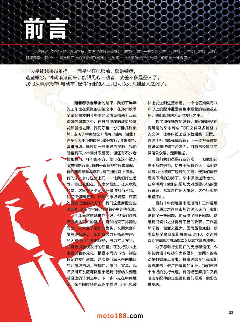 隨著春季全摩會的結束,我們下半年的工作也在緊張的實施之中,在鄭州秋季全摩會首發的《中南地區市場指南》正在緊張的編纂之中。在日益浮躁的虛擬經濟發酵冒泡之際,我們守著一份寧靜幾許淡然,走訪了中南地區(河南、湖南、湖北)許多大大小小的市場,做好發行,收集資料,調研市場。通過對一線市場的接觸,我們既看到不少市場外表荒蕪,但還有不少老板和我們一樣不離不棄,堅守在這不被人所重視的行業。有的一直在堅持只做摩配,有的兼而電動車配件,有的通過網上貿易,有的深入鄉村送貨上門……讓我們好生感慨:青山依舊在,幾度夕陽紅。讓人寬慰的是,這里有不少企業還做得相當不錯,他們低調而務實,長期的市場調整,在實體百業低迷的狀況下,我們這些摩配企業堅定者,淡泊而寧靜,守望著心中的桃花源。