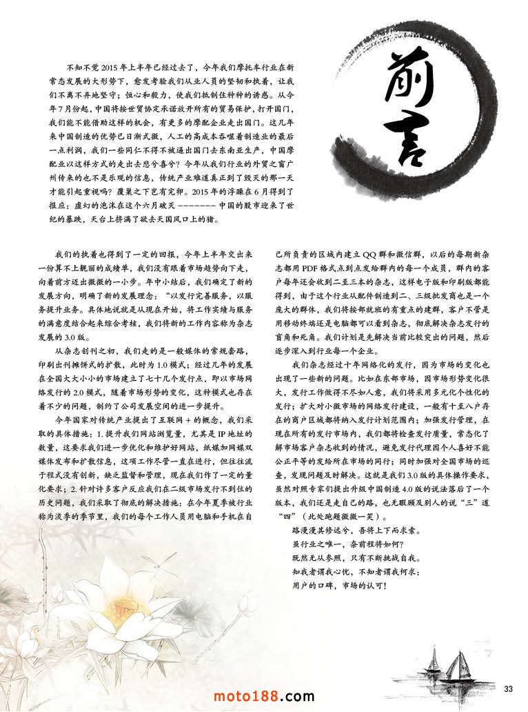 今年國家對傳統(tǒng)產(chǎn)業(yè)提出了互聯(lián)網(wǎng)+的概念,我們采取的具體措施:1.提升我們網(wǎng)站瀏覽量,尤其是IP地址的數(shù)量,這要求我們進一步優(yōu)化和維護好網(wǎng)站,紙媒加網(wǎng)媒雙媒體發(fā)布和擴散信息,這項工作盡管一直在進行,但往往流于程式?jīng)]有創(chuàng)新,缺乏監(jiān)督和管理,現(xiàn)在我們作了一定的量化要求;2.針對許多客戶反應(yīng)我們在二級市場發(fā)行不到位的歷史問題,我們采取了徹底的解決措施:在今年夏季被行業(yè)稱為淡季的季節(jié)里,我們的每個工作人員用電腦和手機在自己所負責(zé)的區(qū)域內(nèi)建立QQ群和微信群,以后的每期新雜志都用PDF格式點到點發(fā)給群內(nèi)的每一個成員,群內(nèi)的客戶每年還會收到二至三本的雜志,這樣電子版和印刷版都能得到,由于這個行業(yè)從配件制造到二、三級批發(fā)商也是一個龐大的群體,我們將按部就班的有重點的建群,客戶不管是用移動終端還是電腦都可以看到雜志,徹底解決雜志發(fā)行的盲角和死角。我們計劃是先解決當(dāng)前比較突出的問題,然后逐步深入到行業(yè)每一個企業(yè)。