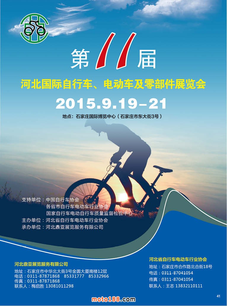 2015.7雜志(曲軸)日期:2015-06-29 點(diǎn)擊:2334 查看原圖 全部展開![]() ![]() ![]() 內(nèi)41 第11屆河北國際自行車、電動(dòng)車及零部件展覽會(huì)