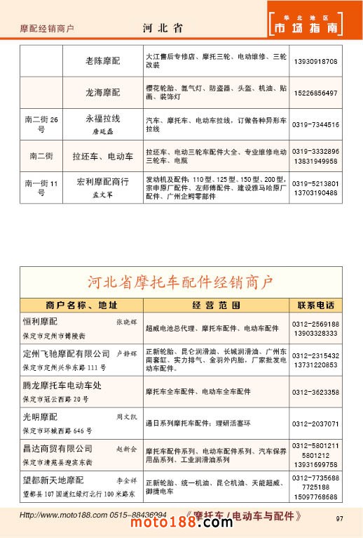 中國摩配市場從上世紀九十年代開始經過高速度的發展,正逐步減速,摩托車行業也漸呈式微,與之緊密相關的后市場的配件與維修也呈逐步下滑之勢,取代摩托車的在發達地區是汽車,欠發達地區是電動兩輪、電動三輪,甚至電動四輪車,隨著經濟的發展,出行的多樣化,也給了消費者多重的選擇。目前現有的摩托車及配件市場,也不再是以純摩托車為主體,有的市場電動車取代了摩托車,有的商店也是混合經營,這些變化在《市場指南》里面都有所反應。這次《北方指南》一些小市場不再單列,并入到相應的省份中去;以前去市場的公交線路,書中也不再列入,因為現在的地圖導航功能十分強大,既新又準。