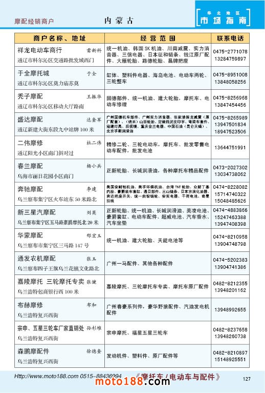 中國摩配市場從上世紀九十年代開始經過高速度的發展,正逐步減速,摩托車行業也漸呈式微,與之緊密相關的后市場的配件與維修也呈逐步下滑之勢,取代摩托車的在發達地區是汽車,欠發達地區是電動兩輪、電動三輪,甚至電動四輪車,隨著經濟的發展,出行的多樣化,也給了消費者多重的選擇。目前現有的摩托車及配件市場,也不再是以純摩托車為主體,有的市場電動車取代了摩托車,有的商店也是混合經營,這些變化在《市場指南》里面都有所反應。這次《北方指南》一些小市場不再單列,并入到相應的省份中去;以前去市場的公交線路,書中也不再列入,因為現在的地圖導航功能十分強大,既新又準。
