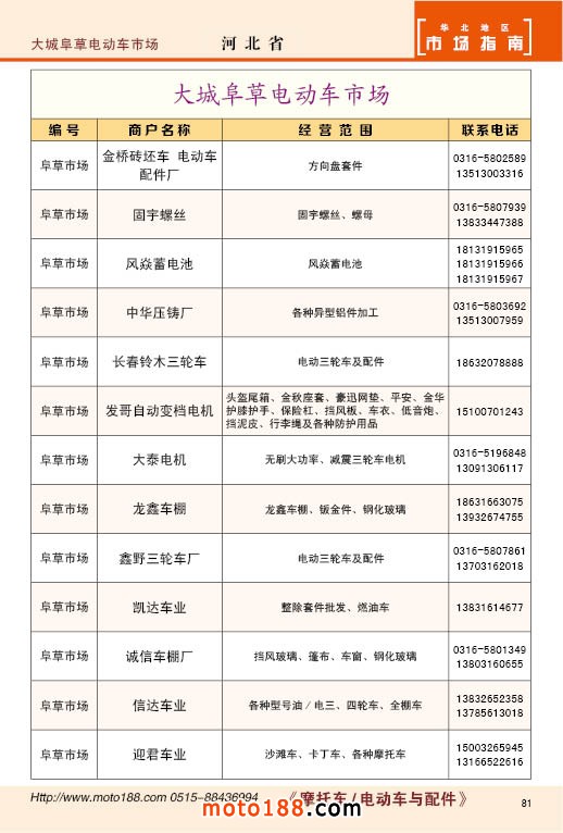 中國摩配市場從上世紀九十年代開始經過高速度的發展,正逐步減速,摩托車行業也漸呈式微,與之緊密相關的后市場的配件與維修也呈逐步下滑之勢,取代摩托車的在發達地區是汽車,欠發達地區是電動兩輪、電動三輪,甚至電動四輪車,隨著經濟的發展,出行的多樣化,也給了消費者多重的選擇。目前現有的摩托車及配件市場,也不再是以純摩托車為主體,有的市場電動車取代了摩托車,有的商店也是混合經營,這些變化在《市場指南》里面都有所反應。這次《北方指南》一些小市場不再單列,并入到相應的省份中去;以前去市場的公交線路,書中也不再列入,因為現在的地圖導航功能十分強大,既新又準。
