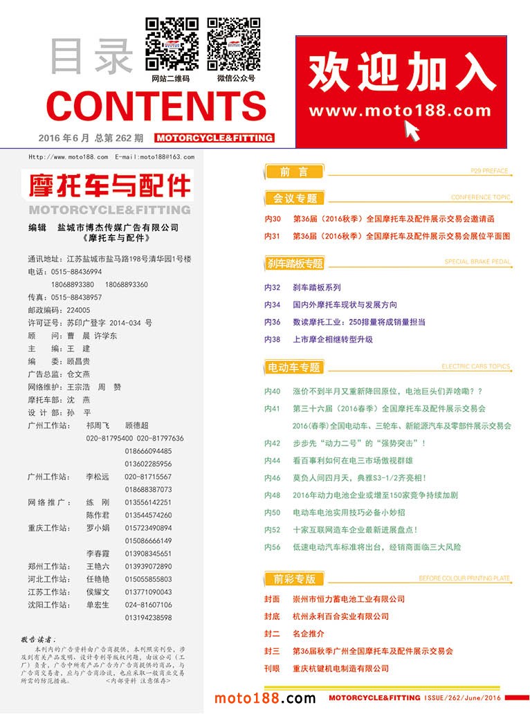 為了做好這個戰略性大調整,我們雜志對內將強化管理,嚴格核算,完善和執行現有的規章制度,運營逐步公開透明,外引內聯,與行業商會以及區域市場代表性企業,以及有特色的運作平臺進行廣泛合作,甚至用股份的形式進行股份制改制,努力做大做強行業這個唯一的宣傳平臺---《摩托車/電動車與配件》,下半年我們將逐步的實施我們計劃;在發行形式上也同樣要有新的突破,我們在下半年雜志里將分期陸續報道我們調整的行動路線,歡迎大家關注!