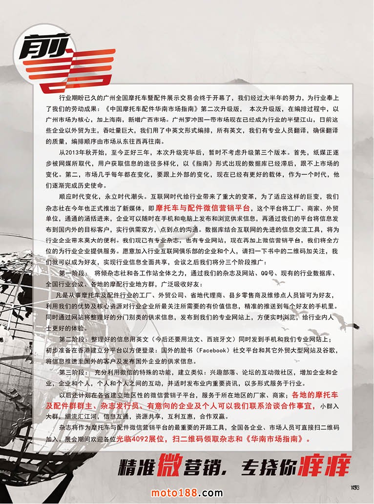 雜志將作為摩托車(chē)與配件微信營(yíng)銷(xiāo)平臺(tái)的最重要的開(kāi)路工具,全國(guó)各企業(yè)、市場(chǎng)人員可直接掃二維碼加入。展會(huì)期間歡迎各位光臨4092展位,掃二維碼領(lǐng)取雜志和《華南市場(chǎng)指南》。