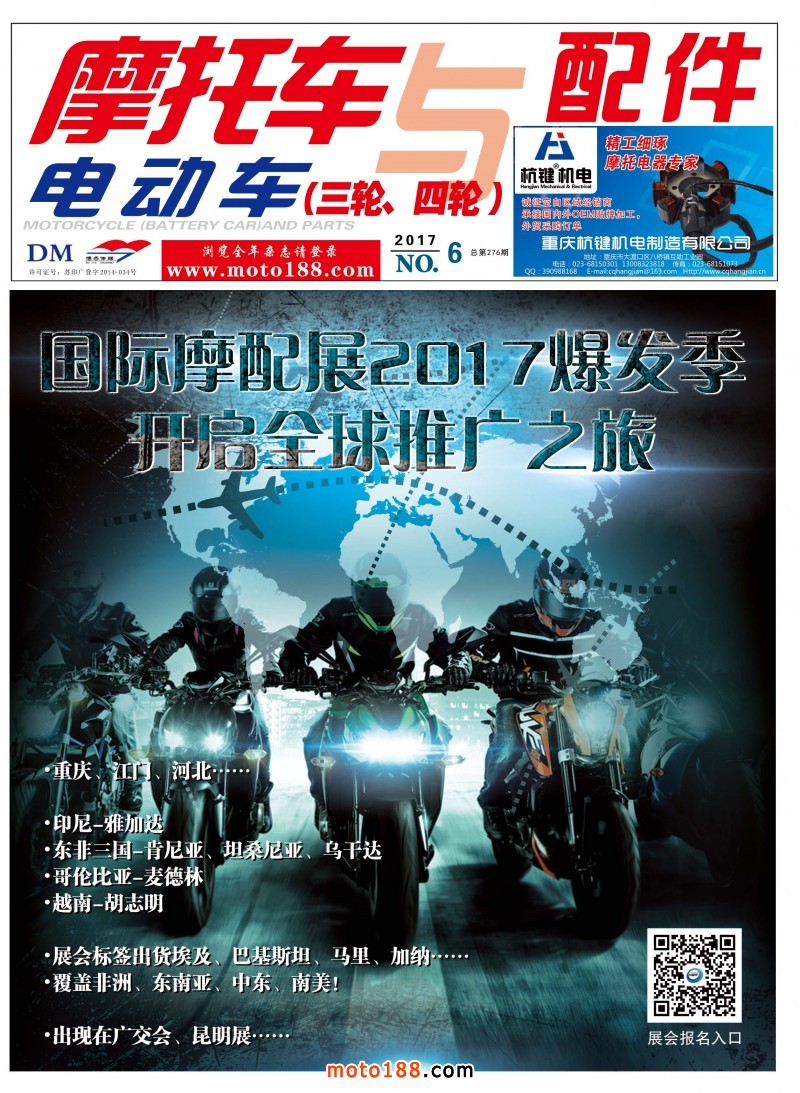 2017.6月《摩托車/電動車與配件》雜志,歡迎大家閱讀日期:2017-06-02 點擊:1294 查看原圖 全部展開![]() ![]() ![]() 封面 國際摩配展2017爆發季 開啟全球推廣之旅