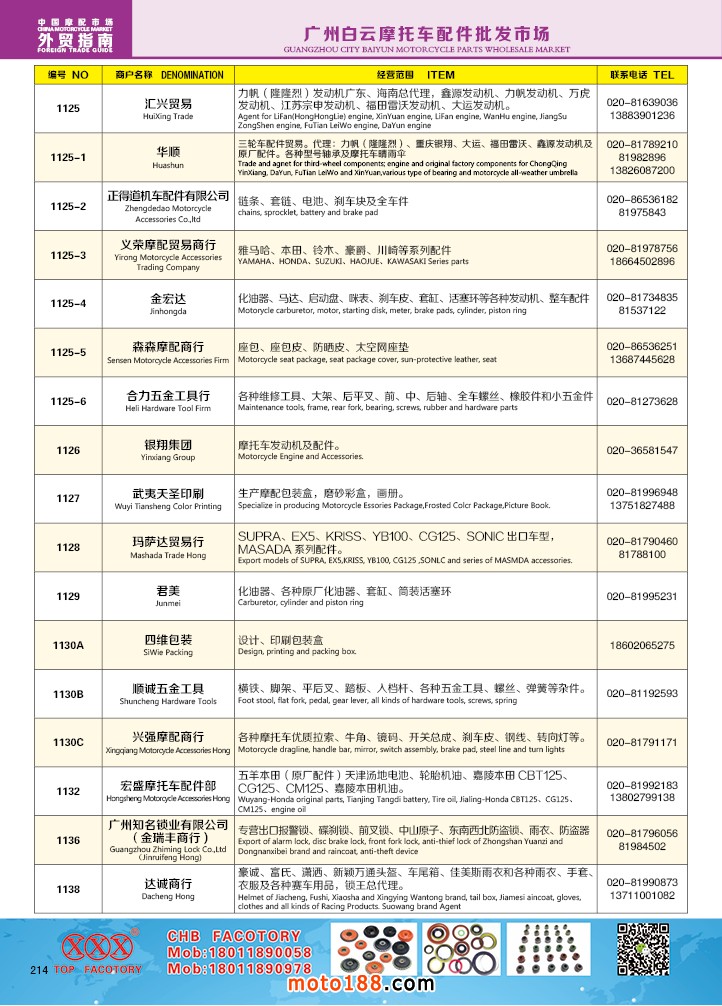 由《摩托車與配件》雜志社,在國內(nèi)首次獨(dú)家推出的《中國摩托車配件外貿(mào)市場指南》工具書正式面世。這是一本專業(yè)定位于外貿(mào)企業(yè)的工具書,隨著一帶一路發(fā)展戰(zhàn)略的推進(jìn),更多企業(yè)走出國門,將產(chǎn)品銷往世界各地,本書收集了國內(nèi)主要從事摩托車配件外貿(mào)的工廠、商家、國外部分駐華采購機(jī)構(gòu)等資料匯總而成.