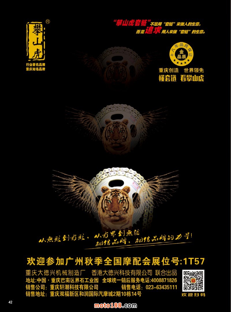 國內(nèi)首本中英文雙語《中國摩配外貿(mào)市場指南》,為從事外貿(mào)的企業(yè)提供了工具。這本書在廣州秋季全摩會上首發(fā)。還將參加明年的江門和重慶春季全摩會。歡迎行業(yè)朋友帶上名片或者手機(jī)掃二維碼,到4079展位來領(lǐng)取《中國摩配外貿(mào)市場指南》和《摩托車與配件》11期雜志。