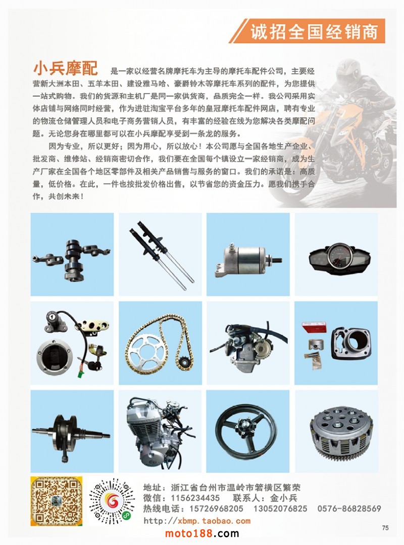國內首本中英文雙語《中國摩配外貿市場指南》,為從事外貿的企業提供了工具。這本書在廣州秋季全摩會上首發。還將參加明年的江門和重慶春季全摩會。歡迎行業朋友帶上名片或者手機掃二維碼,到4079展位來領取《中國摩配外貿市場指南》和《摩托車與配件》11期雜志。